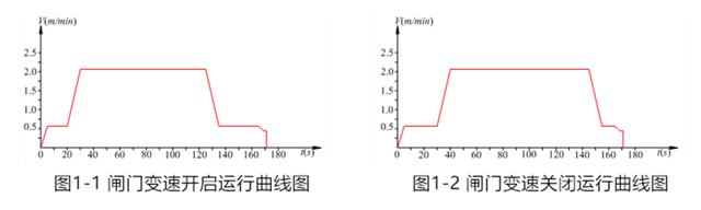 閘門啟閉根據(jù)閘門的運(yùn)行阻力矩特點(diǎn),采用無級變速,并符合“慢—快—慢”的要求。閘門以0.6m/min ~ 2.1m/min ~ 0.6m/min ~ 0.4m/min三種速度,參考下列曲線運(yùn)行,閘門開啟時的運(yùn)行曲線,可按下圖1-1控制;閘門關(guān)閉時的運(yùn)行曲線,可按下圖1-2控制,全程運(yùn)行時間約為170s左右。具體應(yīng)根據(jù)閘門的實(shí)際受力情況作調(diào)整。